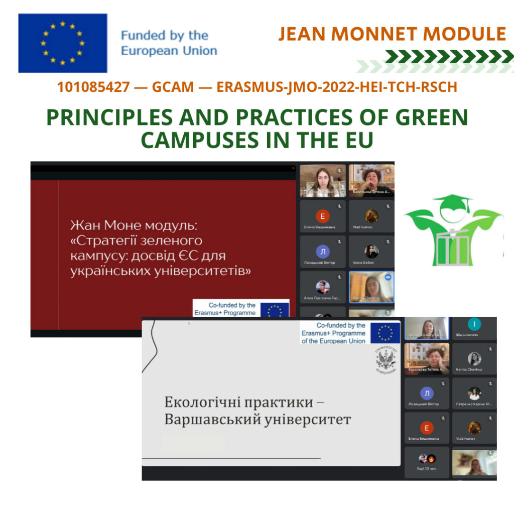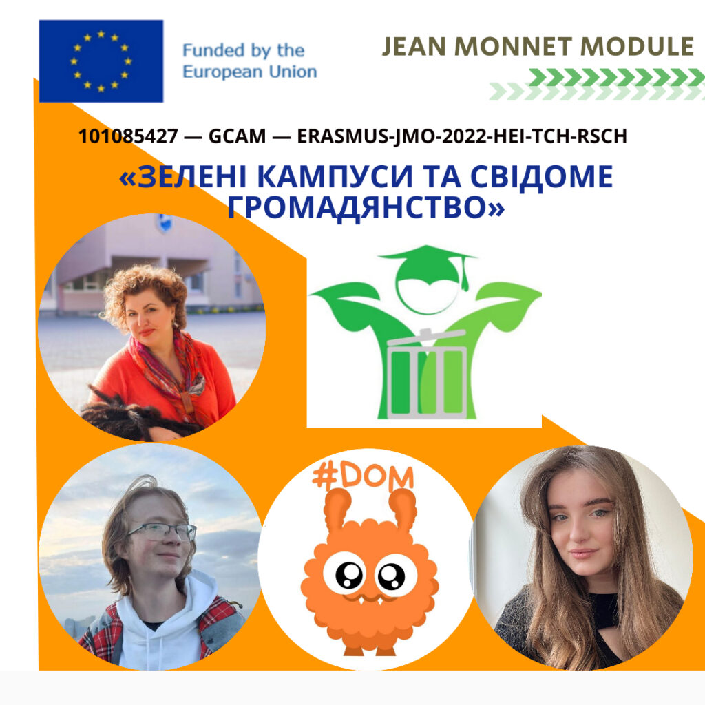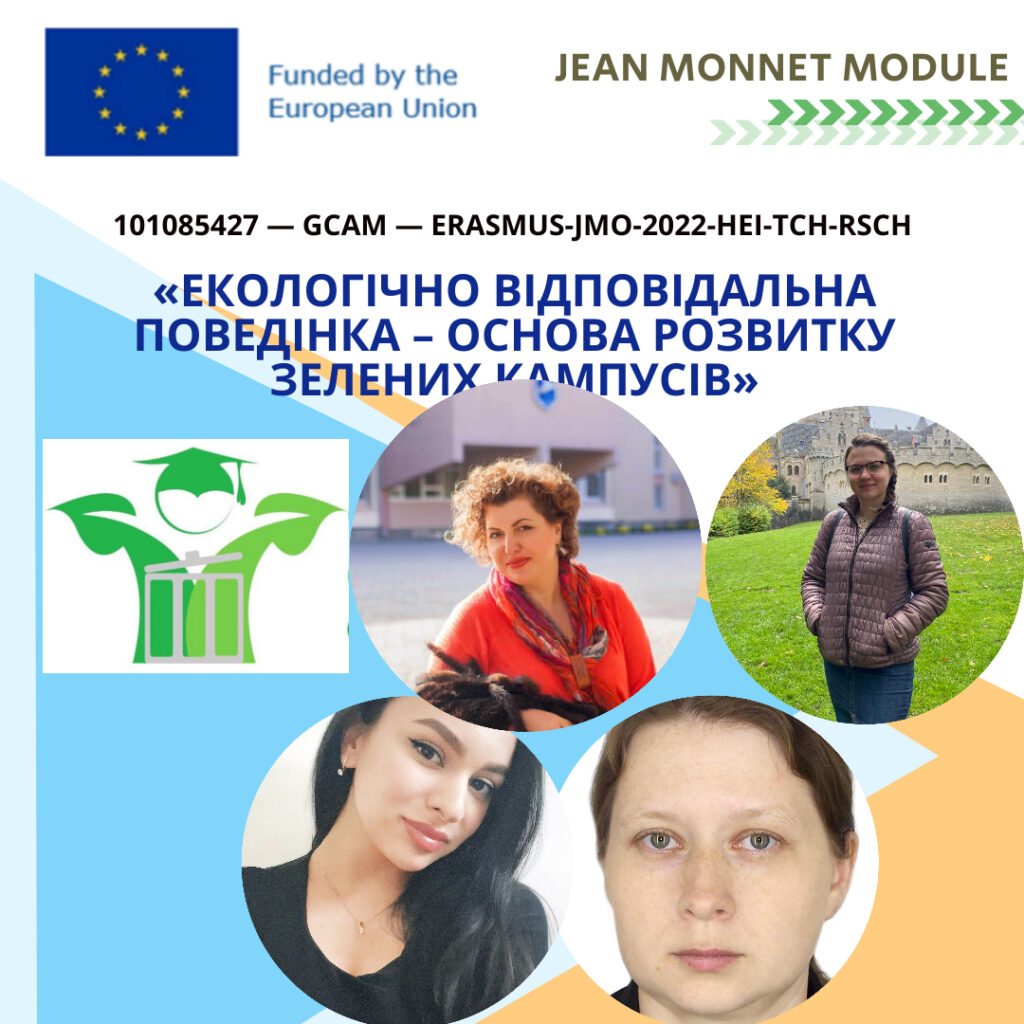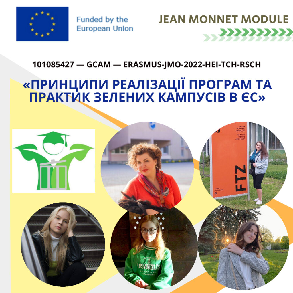 Реалізація проєкту Жана Моне «Green Campus Strategies: EU Experience for Ukrainian Universities» (2022-2025, 101085427 — GCAM — ERASMUS-JMO-2022-HEI-TCH-RSCH) направлена на ознайомлення студентів та аспірантів з кращими науковими і педагогічними практиками, студентськими ініціативами щодо забезпечення кліматичної нейтральності та екологічної відповідальності в університетській спільноті.