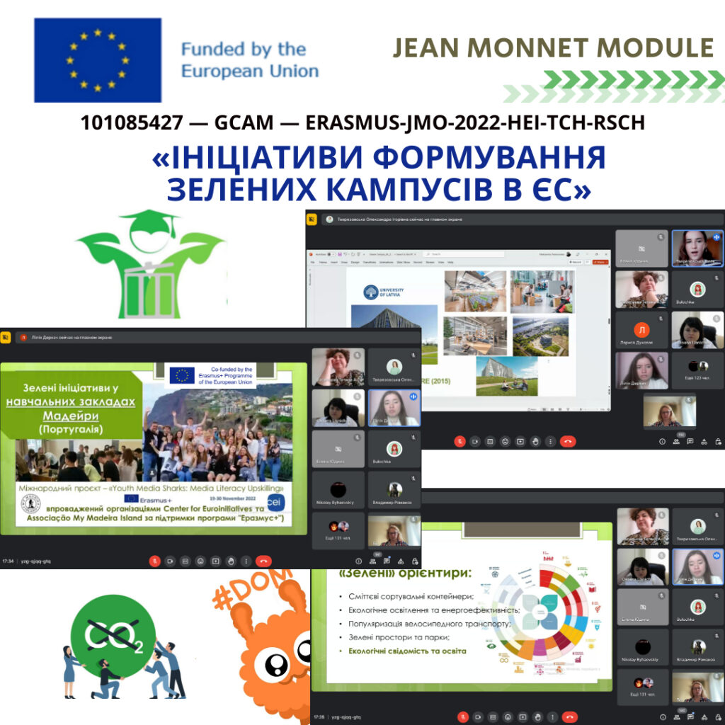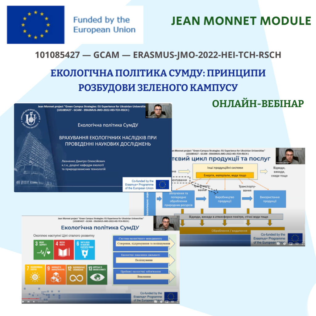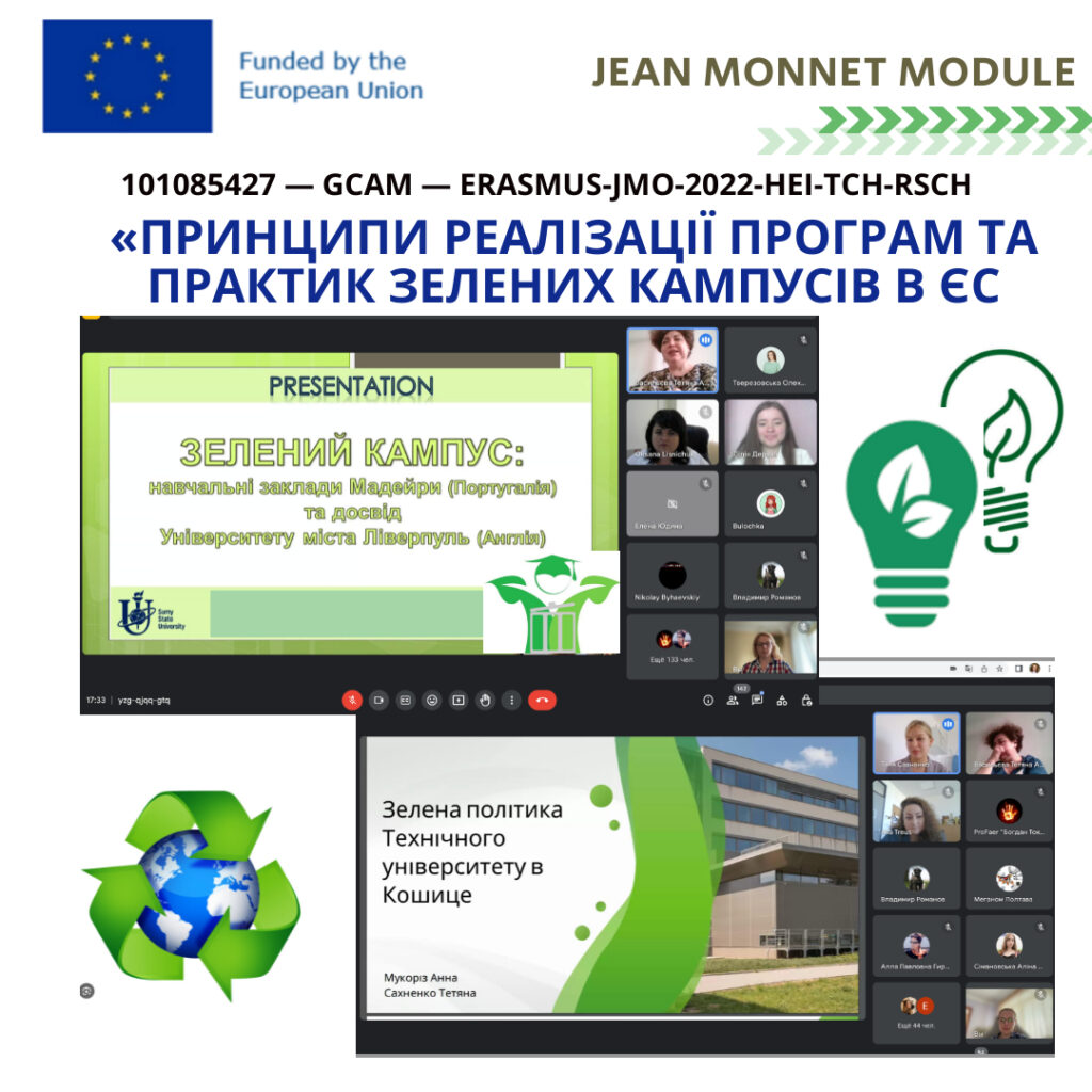 25 травня 2023 року, в рамках реалізації проєкту «Green Campus Strategies: EU Experience for Ukrainian Universities» 2022-2025, 101085427 — GCAM — ERASMUS-JMO-2022-HEI-TCH-RSCH та інтенсивного курсу «Політика згуртованості ЄС: стратегії зеленого кампусу для сталого розвитку», було проведено вебінар, присвячений ініціативам формування зелених кампусів. На он-лайн лекції-дискусії були присутні більше 100 слухачів, студентів та аспірантів спеціальностей «Маркетинг», «Менеджмент», «Економіка, «Фінанси» Сумського державного університету, Полтавського університету економіки і торгівлі, Національного університету «Чернігівська політехніка».