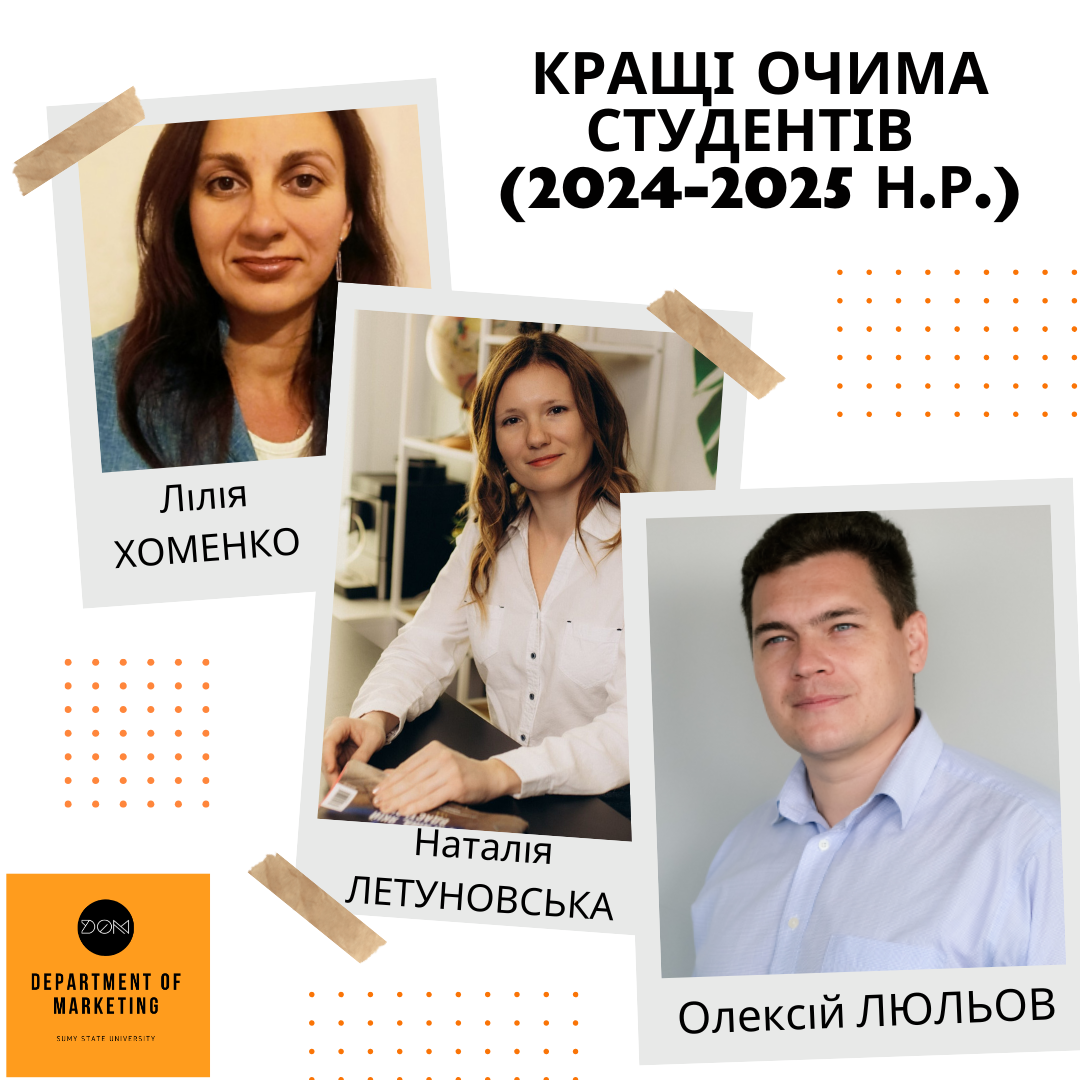 Представники кафедри маркетингу: проф. Олексій ЛЮЛЬОВ, доцент Наталія ЛЕТУНОВСЬКА, старший викладач Лілія ХОМЕНКО стали переможцями щорічного конкурсу «Кращий викладач очима студентів» (2024-2025 н.р.).