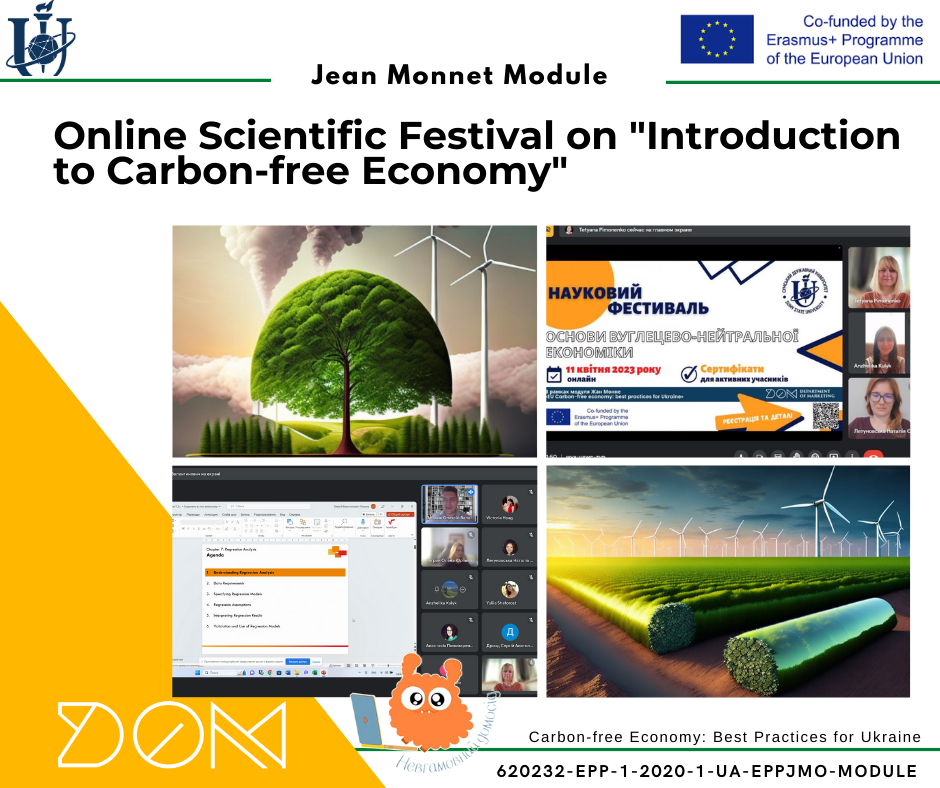 В рамках реалізації проєкту Жана Моне «Вуглецево нейтральна економіка: кращі практики для України» (620232-EPP-1-2020-1-UA-EPPJMO-MODULE) 19 квітня 2023 року студенти-бакалаври кафедри маркетингу прийняли участь у онлайн вебінарі, присвяченому головним цілям реалізації політики Green Deal та забезпечення кліматичної нейтральності.