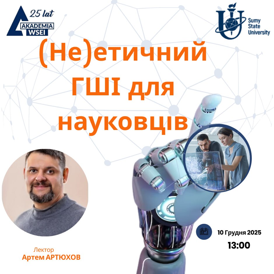 Під час лекції буде розглянуто ключові етичні аспекти використання генеративних штучних інтелектів у науковій діяльності, ризики та обмеження їх застосування, а також принципи відповідального використання таких технологій у дослідженнях та академічних публікаціях.