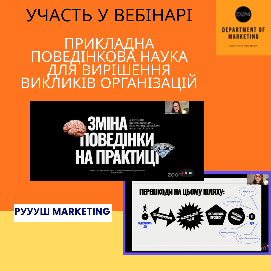 4 березня 2026 року студенти першого курсу спеціальності «Маркетинг» у рамках дисципліни «Поведінка споживача» (викладач – доцент кафедри маркетингу Наталія ЛЕТУНОВСЬКА) взяли участь у вебінарі «Прикладна поведінкова наука для вирішення викликів організацій» від проєкту РУУУШ. Спікер Марія Фронощук має ступінь MSc з Behavioural Science Лондонської школи економіки (LSE) та є членом Global Association of Applied Behavioural Scientists. Під час вебінару було розглянуто практичне застосування поведінкової науки у діяльності сучасних організацій. Спікерка наголосила, що більшість цілей компаній у підсумку зводяться до зміни поведінки людей: мотивування їх почати виконувати нові дії, робити певні дії частіше або відмовлятися від старих звичок.
