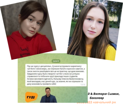 Пройшовши та успішно закінчивши курс “Сучасні інструменти в маркетингу: чат-боти”, я дізналася як створюються чат-боти, навіщо вони потрібні, як саме вони допомагають оптимізувати роботу бізнесу. Дуже сподобався матеріал курсу, повністю зрозумілий та доступний для розуміння навіть тим, хто раніше не створював чат-боти.