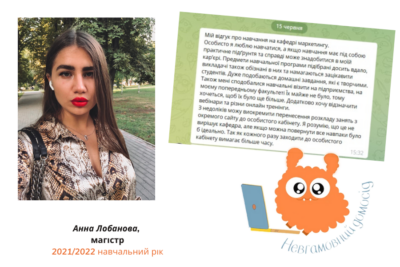 Привітний персонал, чуйні викладачі та упритул гарна атмосфера — реально “ДОМ”. Якщо б не було карантину та війни — це був би мабуть найкращий рік мого навчання, оскільки навіть з перших тижнів стало зрозуміло, що на кафедрі цікаво — усі “зачепились” чогось особливого, і варто сказати, що за 4 роки на іншій кафедрі, ніколи не був на екскурсії, а ось на маркетингу за буквально 2 місяці навчання уже багато де побував — завод Козаченка, Полісан (або Орабас), вони короткі, але у той же час крутий курс від Польщі. Впевнений, що якщо б не світові обставини, то екскурсій було б море, тим що я сам був би у захваті споглядувати цьому.